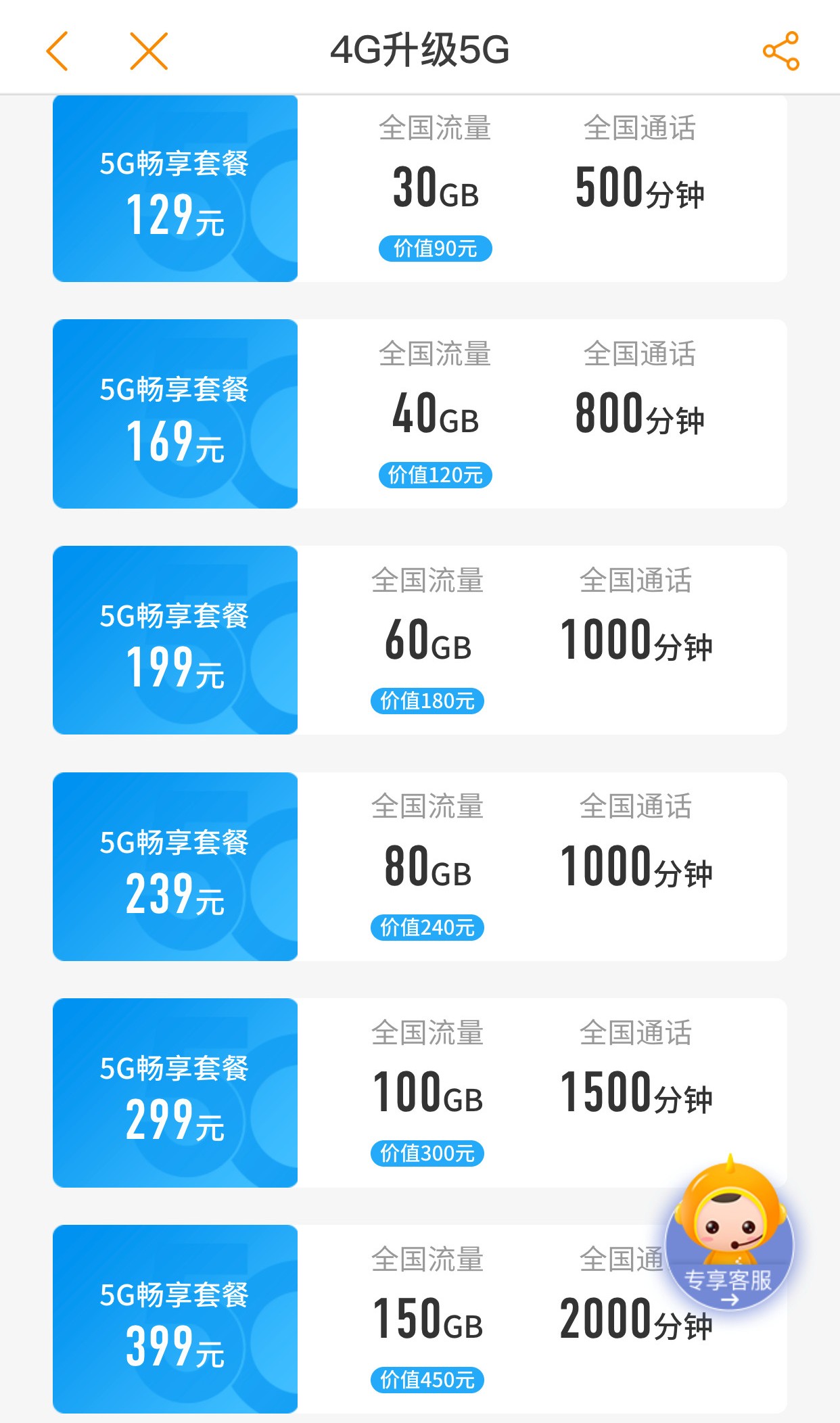 中國聯(lián)通套餐分為129元、159元、199元、239元、299元、399元和599元七個(gè)檔位,包含的流量從30GB-300GB不等。